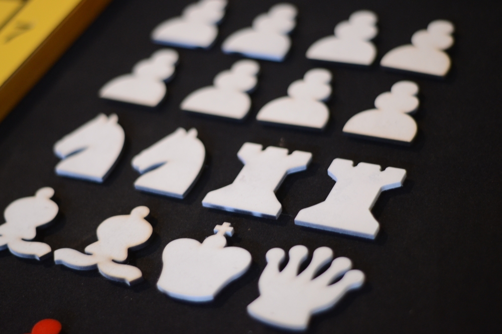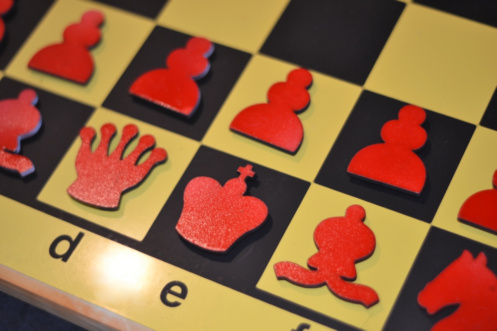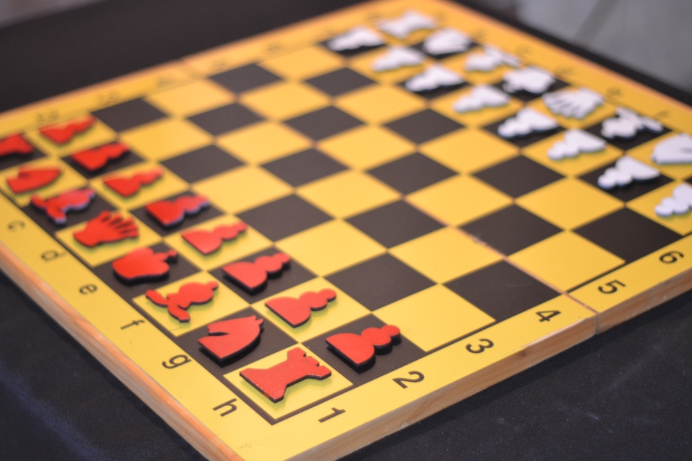 Montado en madera, plegable, color de fondo amarillo. Este implemento es primordial para hacer clases de ajedrez, las piezas de color rojas y blancas son caladas en trupan con im