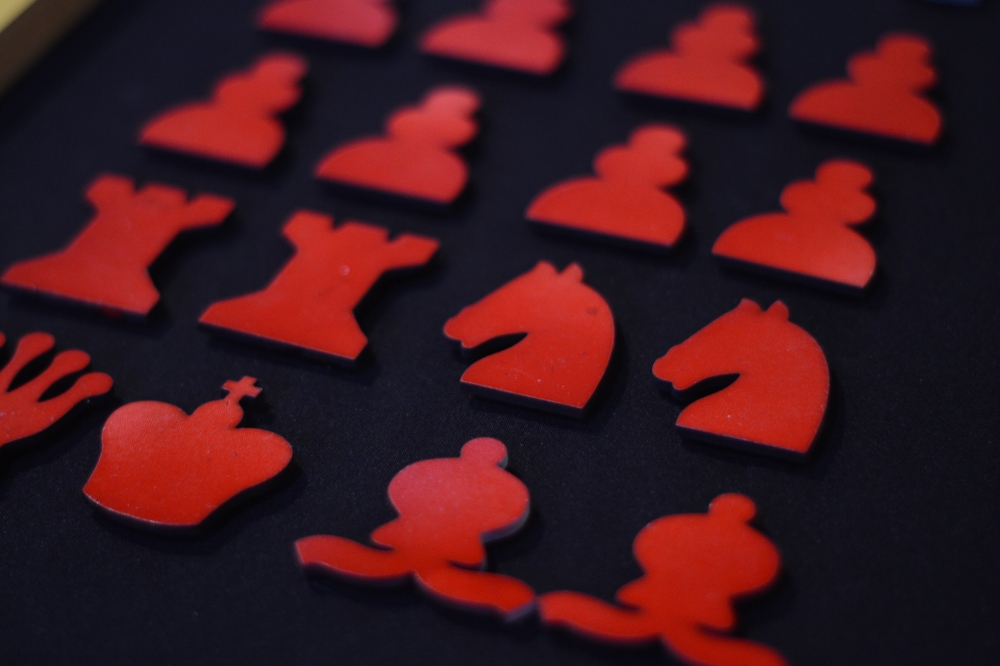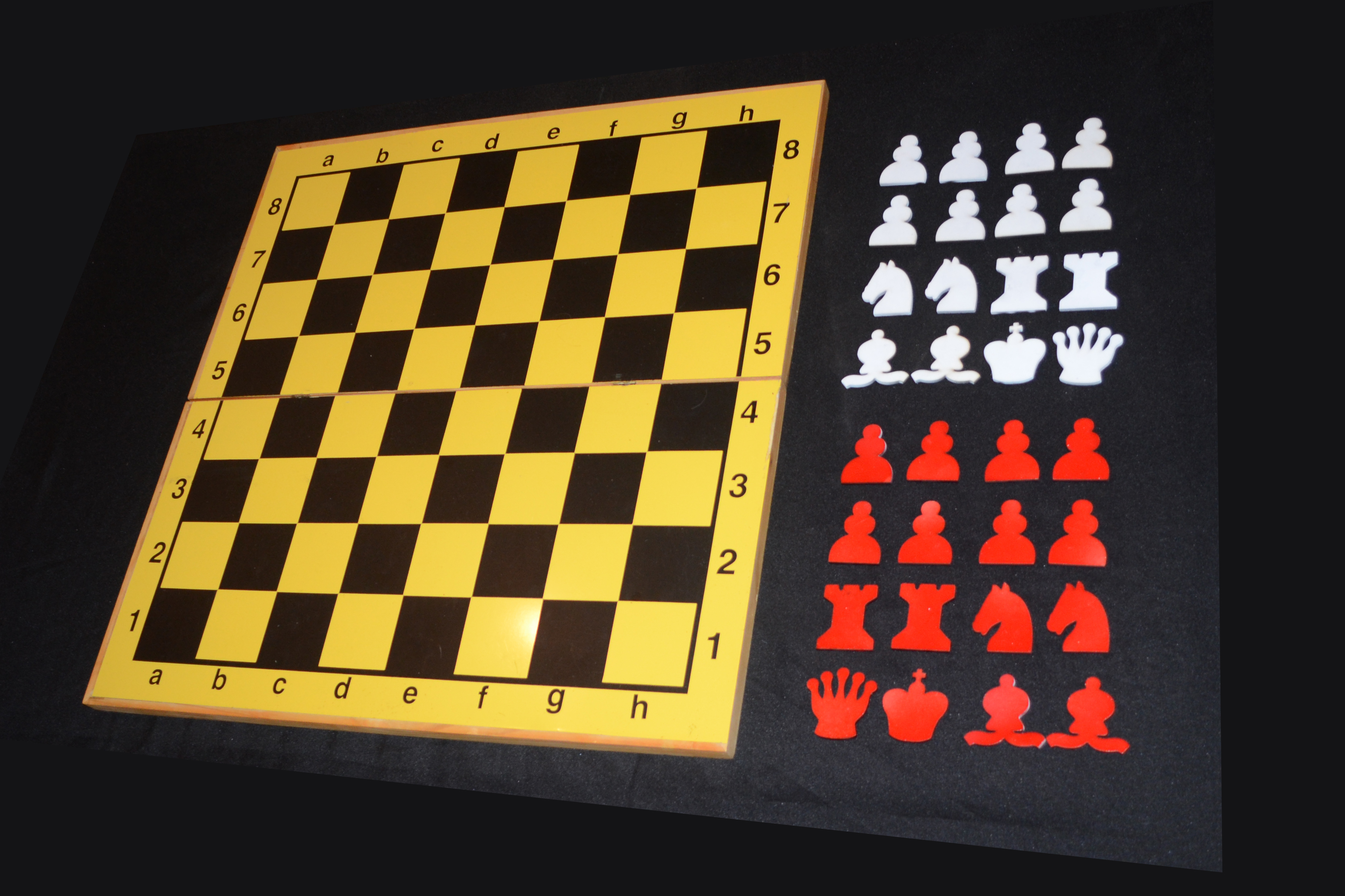 Montado en madera, plegable, color de fondo amarillo. Este implemento es primordial para hacer clases de ajedrez, las piezas de color rojas y blancas son caladas en trupan con im